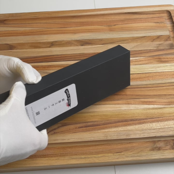 The Ginza Steel KATANA 20 Chef Knife features a sharp 8” blade crafted from 67 layers of Damascus VG10 steel, offering superior edge retention and durability. The ergonomic G10 handle ensures a secure, comfortable grip, perfect for professional chefs and culinary enthusiasts.