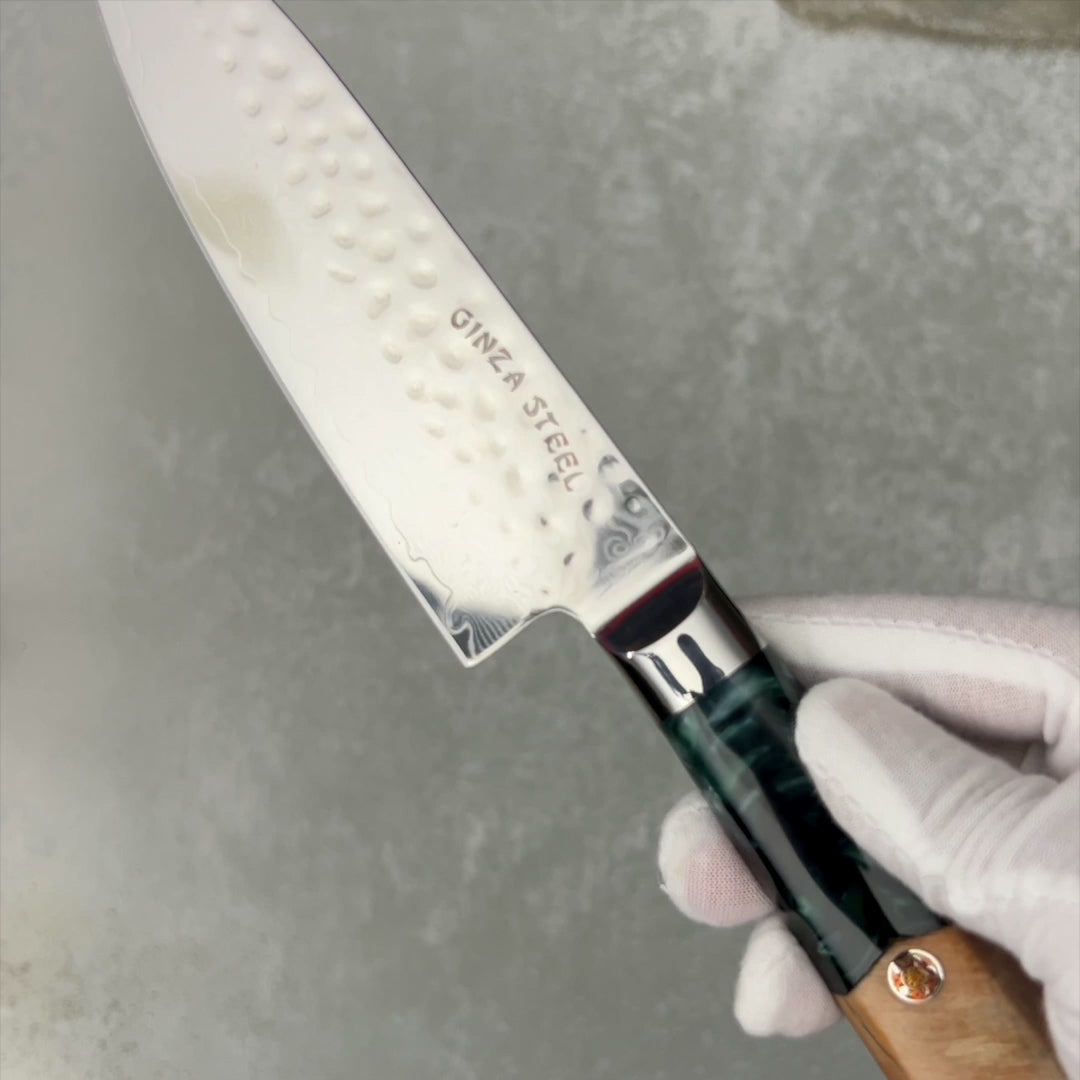 Discover the perfect blend of precision and elegance with the Ginza Steel Kaze Katana Chef Knife. Featuring a 15cm blade forged from VG10 Damascus steel, this knife is renowned for its sharpness and exceptional edge retention. The hammered blade design minimizes friction, ensuring smooth and effortless cutting.